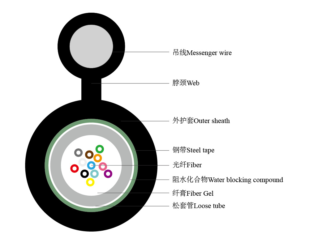 그 구조는젤로 채워진 중앙 느슨한 튜브,밸브제일 테이프 장갑, 그리고별도의 메신저 와이어1 또는 a진료된 철선또는단일 철선∼극에서 극으로 나가는 데 이상적인 강하고 신뢰할 수 있는 8형 프로필을 형성합니다.